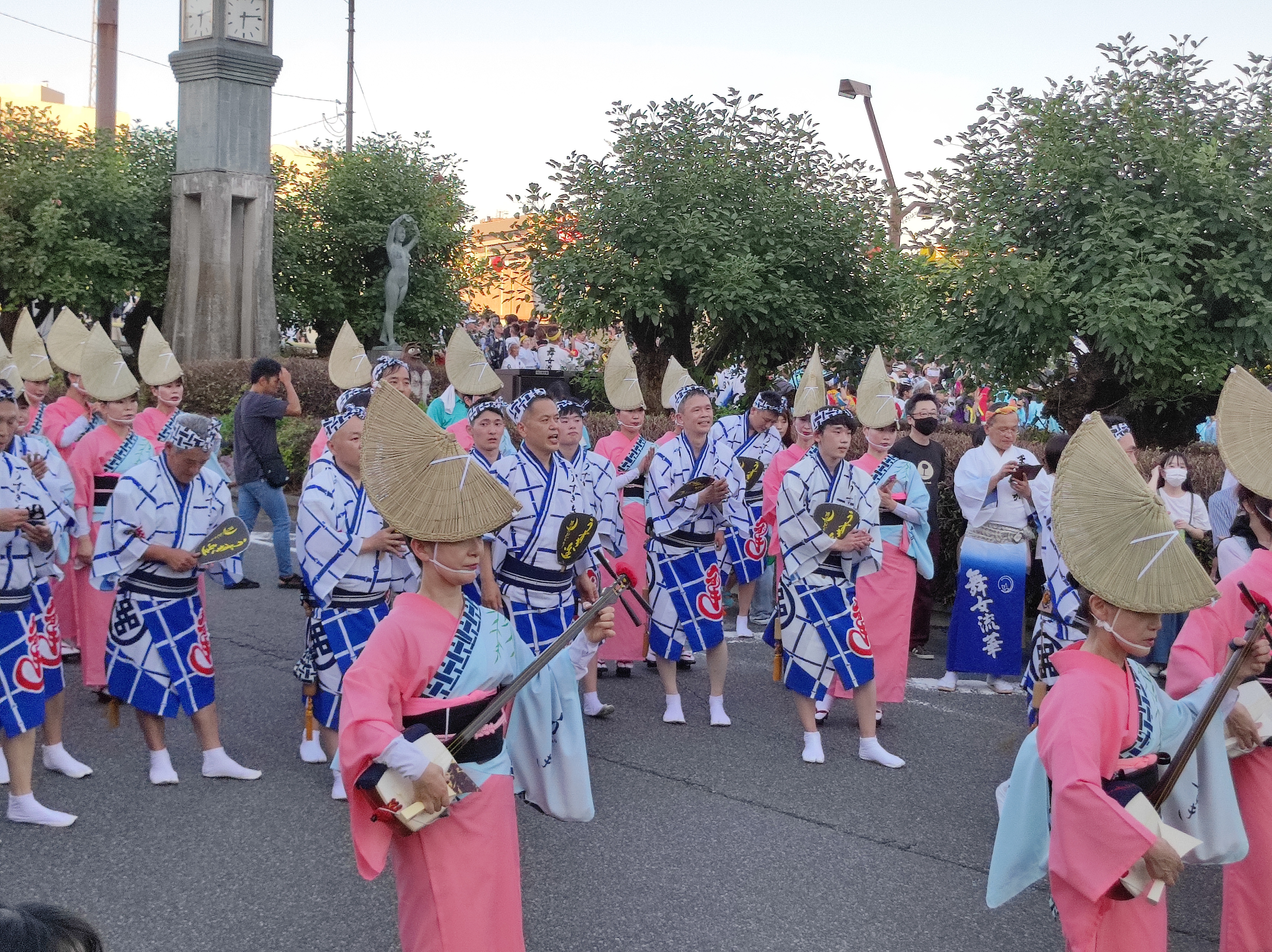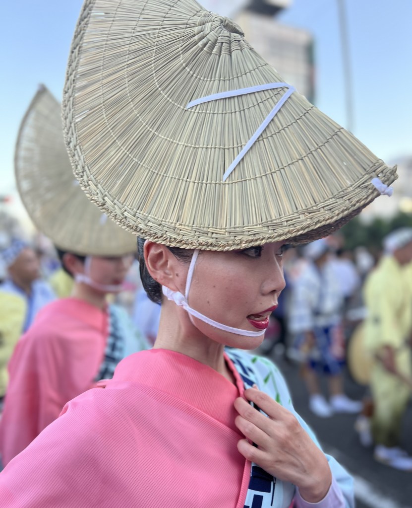 Oggi come ieri, tra gli elementi più caratteristici di Awa Odori vi sono la sua musica e la sua danza, distintiva per i suoi movimenti eleganti e ritmici. I partecipanti, aggiungendo un tocco visivamente accattivante alla performance, indossano costumi tradizionali, tra cui yukata (kimono estivi) per le donne e happi (giacche giapponesi) per gli uomini, e si esibiscono in movimenti energici e ritmati lungo le strade della città. La musica, composta principalmente da flauti, tamburi e shamisen (uno strumento a corda giapponese), accompagna i ballerini, creando un’atmosfera coinvolgente e festosa: i gruppi di danza, noti come “ren”, sono composti da persone di tutte le età e background. Ognuno ha il suo stile unico e le sue coreografie, che vanno dal tradizionale al contemporaneo. I partecipanti si esibiscono con passione e energia contagiosa, coinvolgendo gli spettatori lungo il percorso della parata.