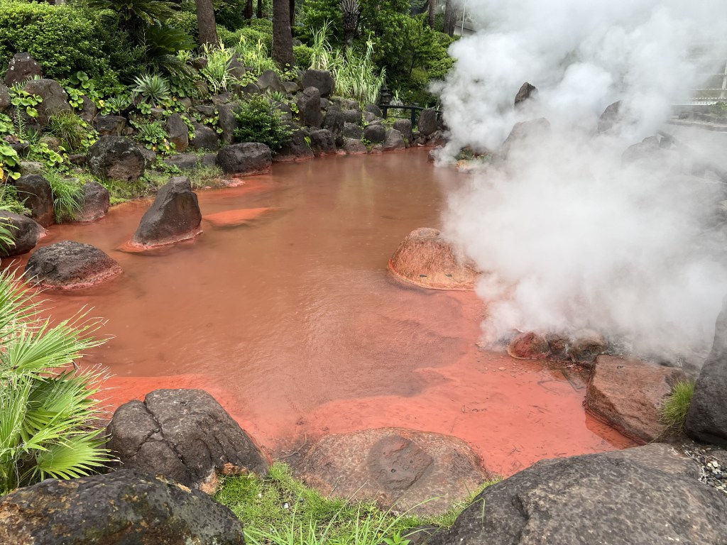 - Chinoike Jigoku (Inferno del Lago di Sangue): la più antica e forse la più fotografata, nota per il suo colore rosso vivo dovuto agli ossidi di ferro e magnesio nel terreno. L’argilla di questo inferno sembra essere un toccasana per la pelle e quindi nel negozio di souvenir all’ingresso del sito è possibile acquistare prodotti estetici realizzati con quanto prelevato dal fondo dell’inferno.