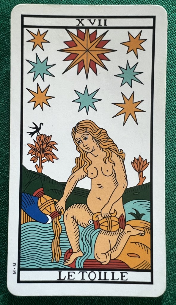 Immaginiamo ora di estrarre come carta singola la “Stella”. Il suo significato è profondamente positivo e incoraggiante. La “Stella” rappresenta speranza, rinnovamento e guida spirituale. È una carta che invita alla calma, alla guarigione e alla fiducia nell’universo. Il suo simbolismo è legato alla luce che arriva dopo un periodo di oscurità, indicando che il consultante sta entrando in una fase di chiarezza, ispirazione e possibilità. È un segno che ci sono forze superiori che stanno lavorando a favore della persona, e suggerisce che è il momento giusto per lasciar andare le preoccupazioni e confidare nel futuro.