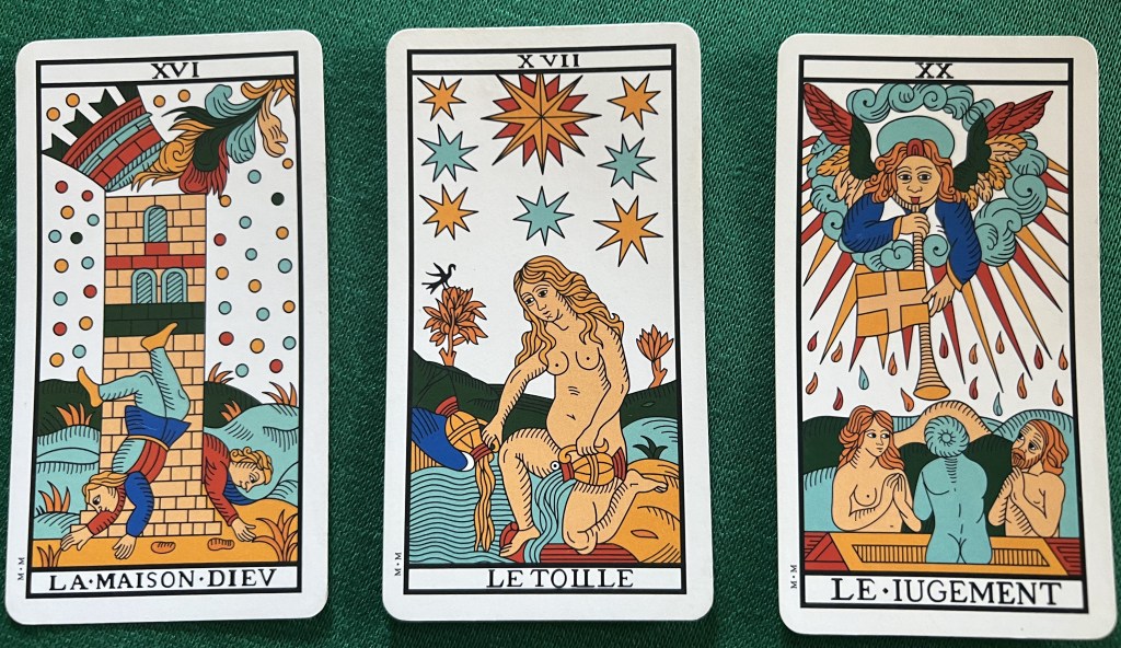 Immaginiamo adesso che la carta de la “Stella” sia preceduta dalla “Torre” e seguita dal “Giudizio”. La narrativa diviene ora decisamente più complessa. La “Torre” rappresenta ancora una volta una crisi, un evento improvviso o la rottura di vecchie strutture che non servono più. In questo caso, potrebbe indicare che il consultante ha attraversato (o sta attraversando) un periodo di distruzione o cambiamento improvviso.