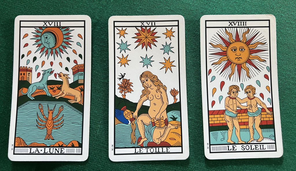 per fare un altro esempio, ipotizziamo ancora l’estrazione della carta la “Stella”. Il suo significato quale carta singola non cambia rispetto a quanto già detto. Questa volta, tuttavia, immaginiamo che la carta sia preceduta dalla “Luna” e sia seguita dal “Sole”.