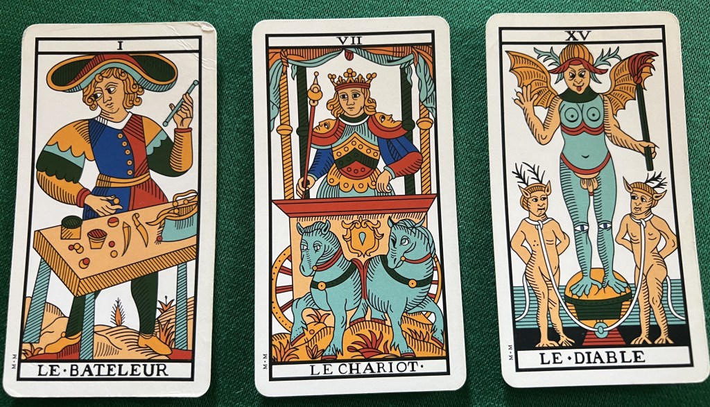 Quando il “Carro” è, però, letto in relazione ad altre carte, come in una sequenza preceduta dal “Mago” e seguita dal “Diavolo”, per esempio, l’interpretazione diventa più complessa e sfumata. Il “Mago” prima del “Carro” suggerisce che la persona ha acquisito abilità, risorse e conoscenze necessarie per affrontare la sfida imminente. Questa combinazione indica che il movimento e la determinazione rappresentati dal “Carro”sono supportati da una grande capacità creativa e padronanza di sé. Il “Mago” dona al “Carro” una base di potere personale e controllo. Il “Diavolo” dopo il “Carro”, invece, introduce una nota di cautela. Se il “Carro” simboleggia una corsa verso il successo, il “Diavolo” avverte dei potenziali pericoli: la tentazione di abusare del proprio potere o di perdere di vista i veri obiettivi in favore di piaceri o attaccamenti materiali. L’intero arco delle tre carte suggerisce una fase di grande energia e movimento, ma con il rischio di perdere la direzione se non si rimane consapevoli delle proprie intenzioni e tentazioni.