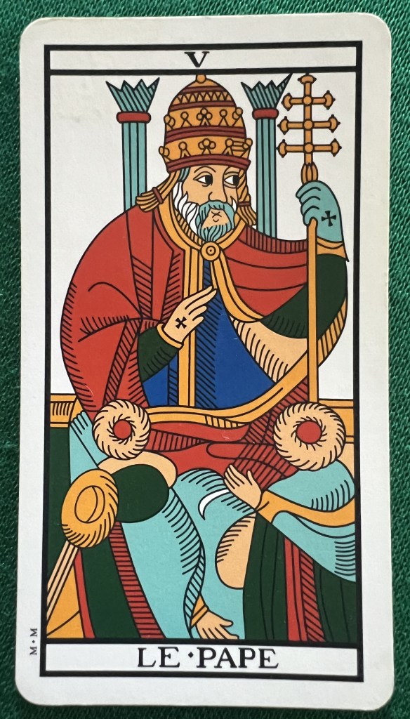 Per dimostrare il modo in cui gli arcani minori giocano un ruolo irrinunciabile in una lettura (da qui l’importanza di imparare a lavorare con l’intero mazzo di carte), ipotizziamo di estrarre come carta singola la carta del “Papa”. Questa carta nei tarocchi rappresenta tradizione, saggezza spirituale e guida morale. È una carta associata all’autorità religiosa o etica, che parla di strutture consolidate, fede e insegnamento. Può indicare la necessità di seguire regole stabilite, cercare consiglio da una figura autorevole o spirituale, oppure di agire in accordo con principi morali e convenzioni sociali. Quando questa carta appare, è spesso un invito a riflettere sui propri valori e a cercare supporto o guida in contesti formali o spirituali. Può rappresentare un mentore o una persona influente che offre saggezza o sostegno morale, oppure suggerire che è il momento di abbracciare un percorso più tradizionale o disciplinato nella vita.