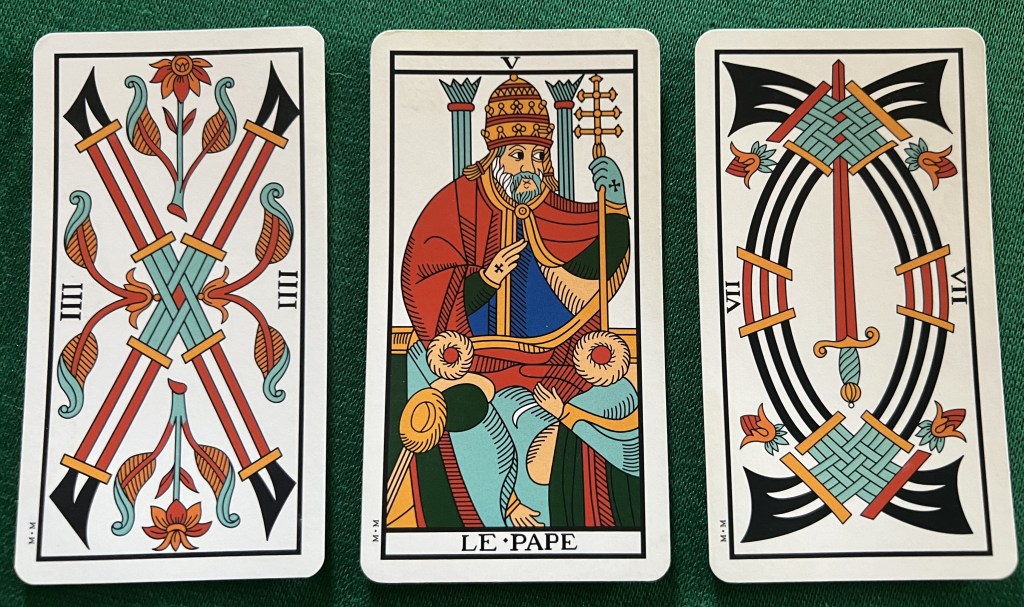 Se però tentiamo una lettura a tre carte ed il “Papa” è preceduto dal “4 di bastoni” e seguito dal “7 di spade”, l’interpretazione assume un contesto più complesso e dinamico. Il “4 di bastoni” rappresenta celebrazione, stabilità e successo raggiunto. È una carta che parla di un momento di gioia e soddisfazione, spesso associato a una conquista personale o professionale. Può indicare una fase di consolidamento, come il completamento di un progetto o un traguardo che porta con sé un senso di armonia e sicurezza. In un contesto relazionale o familiare, può simboleggiare unione, matrimonio o una fase felice di vita domestica. È il simbolo di una base solida da cui partire. Il “Papa” interviene come guida, suggerendo che, dopo aver raggiunto una fase di stabilità e successo, è necessario adottare un approccio etico e riflessivo. Potrebbe indicare la necessità di consultare una figura autorevole o di aderire a valori più elevati. L’influenza del “Papa” suggerisce che, pur essendo in una posizione di forza, è essenziale rimanere fedeli ai propri principi e agire con integrità. Ed ecco arrivare il “7 di spade”: questa carta introduce una nota di cautela, rappresentando inganno, furtività o decisioni strategiche. Il “7 di spade” può indicare che, mentre si è raggiunta una fase di stabilità (4 di Bastoni) e si è guidati dalla saggezza del “Papa”, ci si trova ora di fronte a una situazione in cui qualcuno potrebbe non essere completamente trasparente o in cui è richiesto un approccio intelligente e strategico. Il “7 di Spade” invita a fare attenzione a eventuali comportamenti ingannevoli, sia da parte di altri che nei propri pensieri e azioni. In sintesi, questa sequenza suggerisce che, dopo un periodo di successo e armonia (4 di bastoni), potrebbe emergere una situazione in cui è necessario rimanere fedeli ai propri valori (il Papa), nonostante le tentazioni o i rischi di comportamenti poco chiari o manipolatori (7 di spade). Potrebbe anche significare che qualcuno intorno a te non è del tutto onesto, o che tu stesso stai considerando un approccio che potrebbe deviare dai tuoi soliti principi morali. In questa lettura, il Papa agisce come una figura stabilizzante, un monito a non cedere alle scorciatoie o agli inganni suggeriti dal “7 di spade”. È un invito a mantenere la rotta su un cammino etico e di integrità, anche quando si potrebbe essere tentati di agire diversamente.
