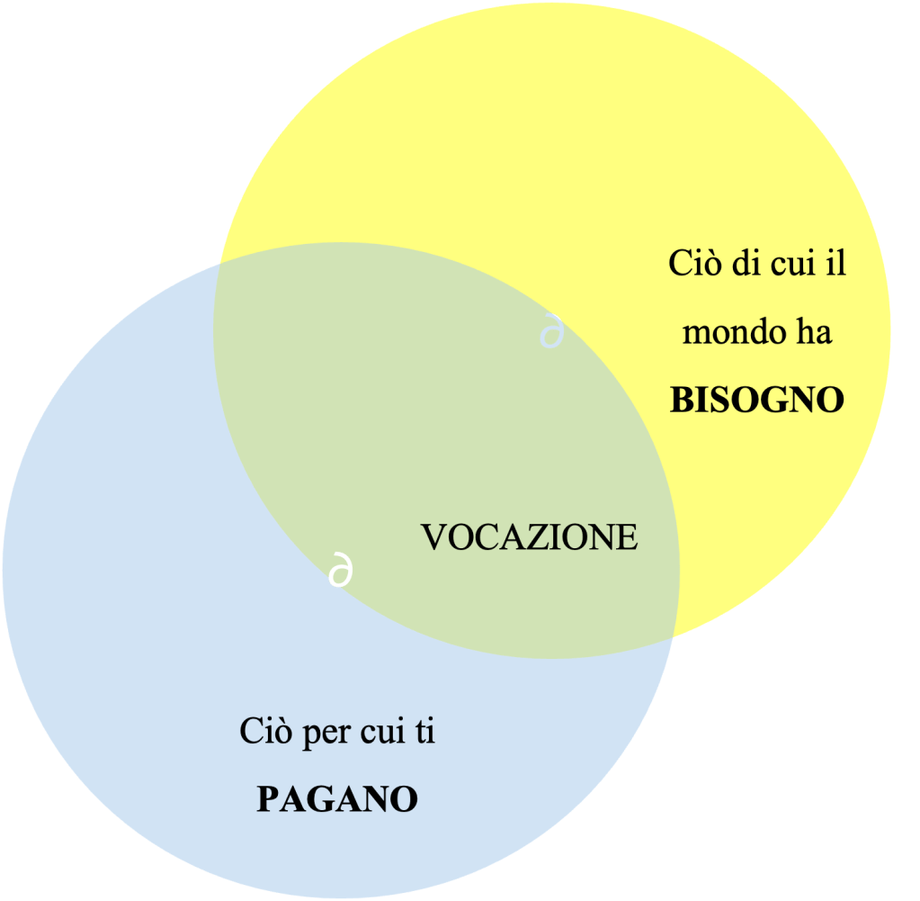 Essere a metà tra “ciò di cui il mondo ha bisogno” e “ciò per cui puoi essere pagato” crea una vocazione. In questa posizione, si risponde a un’esigenza della società e si viene retribuiti per farlo. Tuttavia, se non c’è passione per ciò che si fa o non si hanno le competenze necessarie, il lavoro può diventare un peso, piuttosto che una fonte di soddisfazione. Questa condizione può portare a un senso di sacrificio e di disconnessione, con il rischio di sviluppare un senso di alienazione e di insoddisfazione cronica.