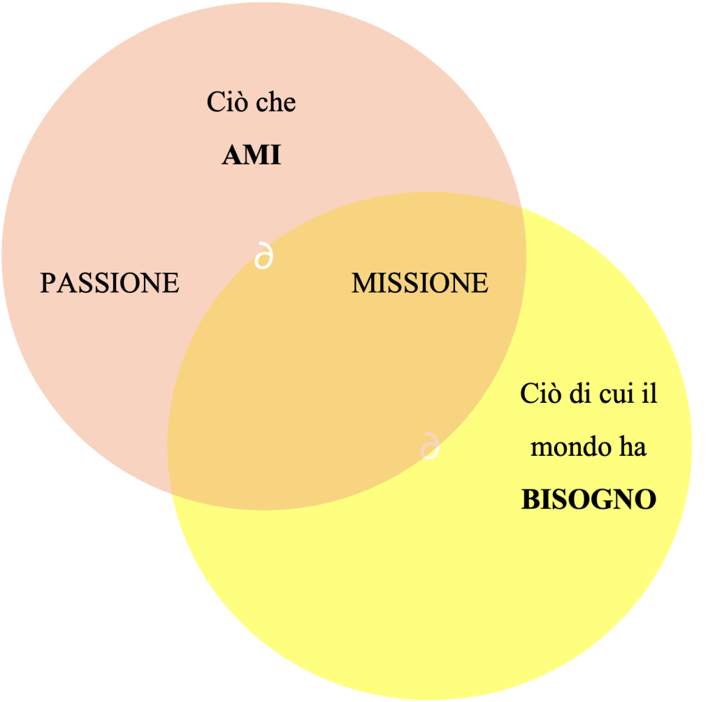 Trovarsi nella posizione intermedia tra “ciò che ami” e “ciò che sai fare bene” genera quella che può essere definita una passione. La passione è una forza potente che spinge a investire tempo ed energia in attività che danno grande soddisfazione personale. Tuttavia, se queste passioni non sono connesse a un bisogno reale del mondo o a una retribuzione economica, possono trasformarsi in una fonte di frustrazione e insoddisfazione così come in un senso di inutilità o di fallimento nel lungo termine.