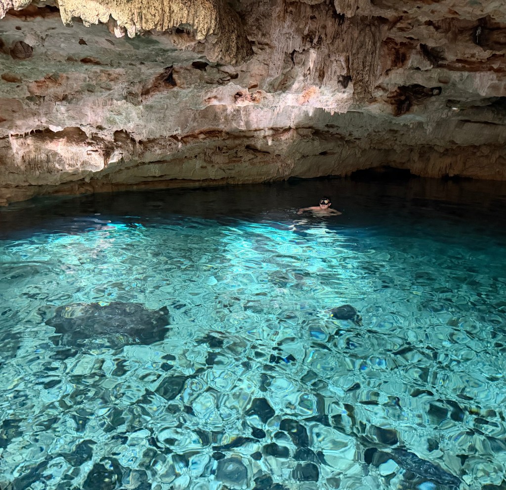 L’acqua è fresca, rigenerante e ha una densità che sembra sostenerti in un abbraccio. Se hai la fortuna di trovarti in un cenote “chiuso” o “semi-aperto” a mezzogiorno, vedrai i raggi del sole penetrare attraverso le radici degli alberi che pendono dal soffitto, creando pilastri di luce liquida. In quel momento, nel silenzio interrotto solo dallo sgocciolio delle stalattiti, capirai perché i Maya li considerassero luoghi divini.